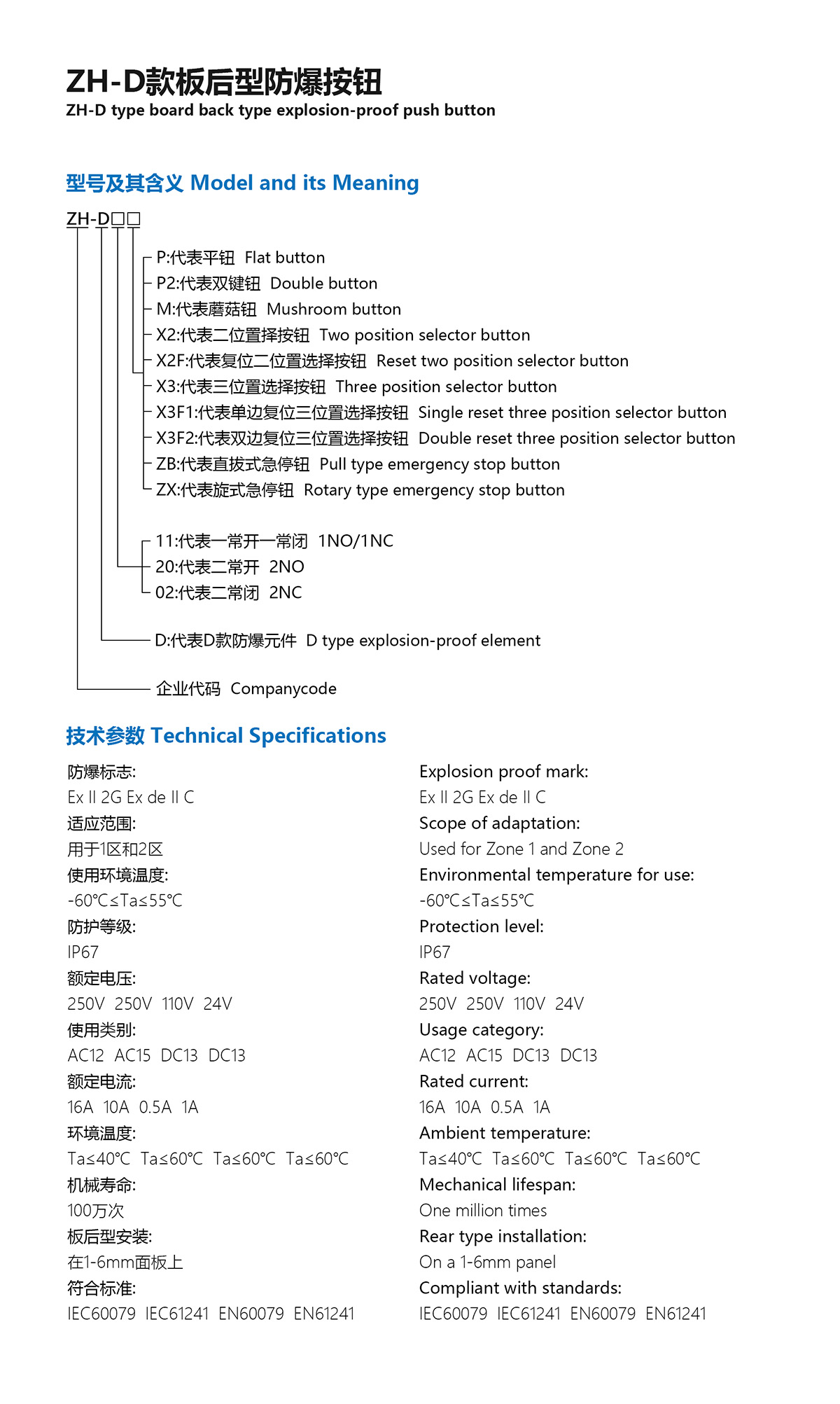 D款板后型增安防爆按钮元件